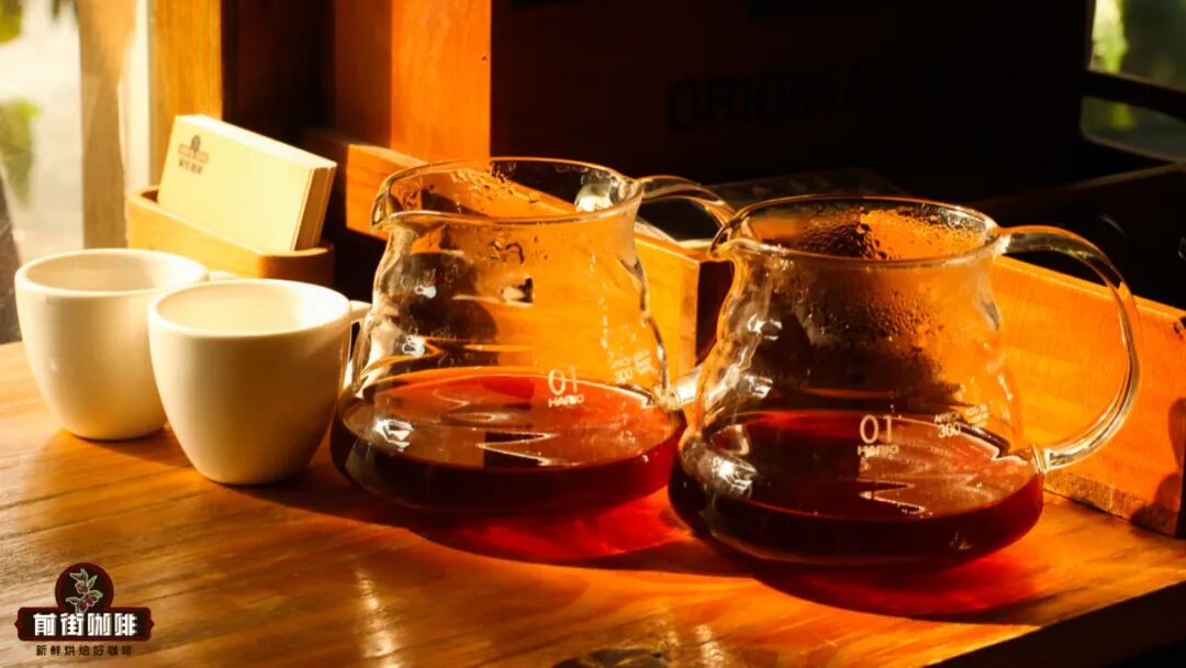 而决定咖啡颜色的主要是咖啡的烘焙程度,当咖啡烘焙程度越深的时候,冲出来的颜色就越黑;当咖啡烘焙程度越浅的时候,冲出来的颜色则越浅。下图是前街使用豆单中的浅烘焙咖啡豆前街埃塞·花魁(左),和深烘焙咖啡豆前街苏门答腊·黄金曼特宁(右)冲煮出来的两壶手冲,大家可以对比一下它们的区别。