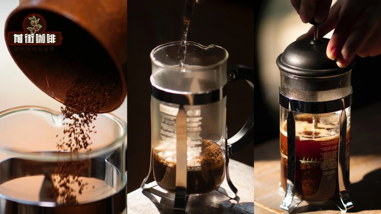法压壶:倒入15g咖啡粉,准备225g热水大幅度倒进壶内,抽气压杆,盖上盖子,等待4分钟。之后缓慢压下压杆,压至滤网位于壶身的一半,把咖啡液倒入马克杯内完成。