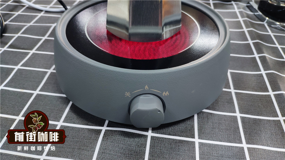 4.当摩卡壶升温到一定温度的时候,当用到摩卡壶发出明显鸣声响起时,把电陶炉设置成小火并打开上壶壶盖。
