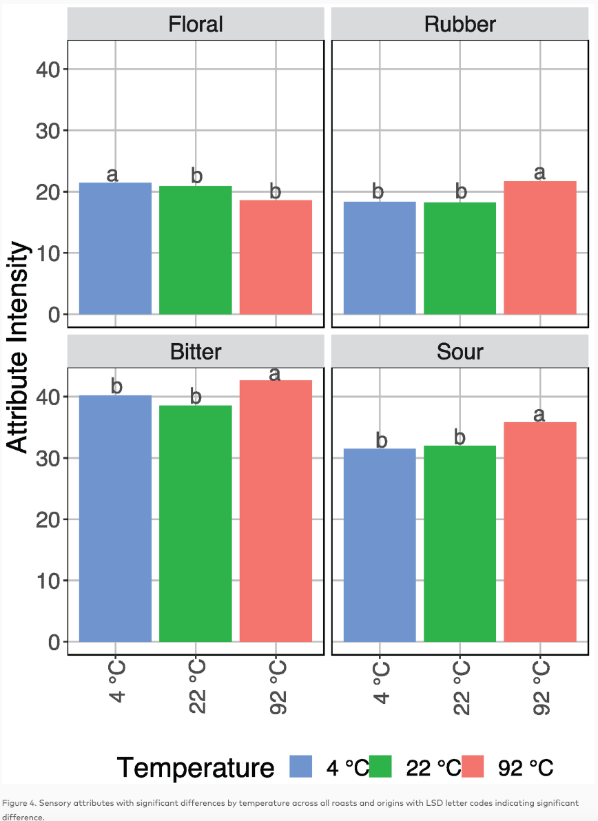 这项研究发现了四种感官属性,它们在统计上显示出与萃取温度相关的显著变化(变化对于所有测试的产地和烘焙水平都是真实的)。在这四个属性中,苦味、酸味和橡胶味,在高温萃取的咖啡中都更高,而花香在低温萃取的咖啡中更高。当然,对于特定的产地和烘焙方式,还会一些额外的感官属性会受到温度的显著影响。