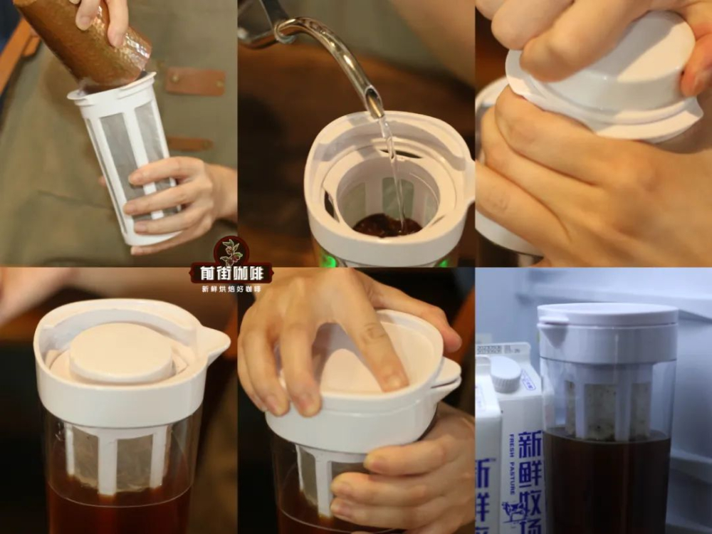 準備好幹凈的冷泡壺,將研磨好的咖啡粉倒入冷泡壺的濾網裏,然後將720g的常溫水倒入咖啡粉中達到充分的潤濕與浸泡。之後將濾網部分的蓋子蓋上,最後把冷泡壺的蓋子蓋上。然後放進冰箱冷藏室低溫萃取12-16個小時即可~