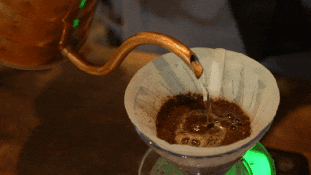 待水位即將見底時(開始露出咖啡粉),我們註入最後壹段熱水(75ml),圍繞濾杯中心,繞小圈註入。