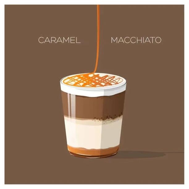 焦糖瑪奇朵:制作時要使用大量牛奶和奶泡,和濕卡布或者厚壹點的拿鐵咖啡區別不大。香草糖漿及香滑的熱鮮奶,面層加上綿綿細滑的奶泡,混和醇厚的濃縮咖啡,再加上軟滑的焦糖醬,香甜醇厚的焦糖瑪奇朵便成為咖啡愛好者品嘗特濃咖啡的好選擇。