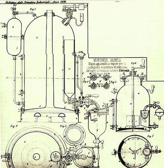 最早的意式濃縮咖啡(Espresso)的製作方式誕生於1884年,一名名爲Angelo Moriondo的意大利人設計了一個獲得專利的濃縮咖啡機模型。最開始意式濃縮咖啡機的製作原理是通過兩個獨立的鍋爐將水燒開後產生蒸汽,在通過蒸汽壓力將熱水增壓(1.5bar左右)通過咖啡粉層,萃取出濃度極高的咖啡液。